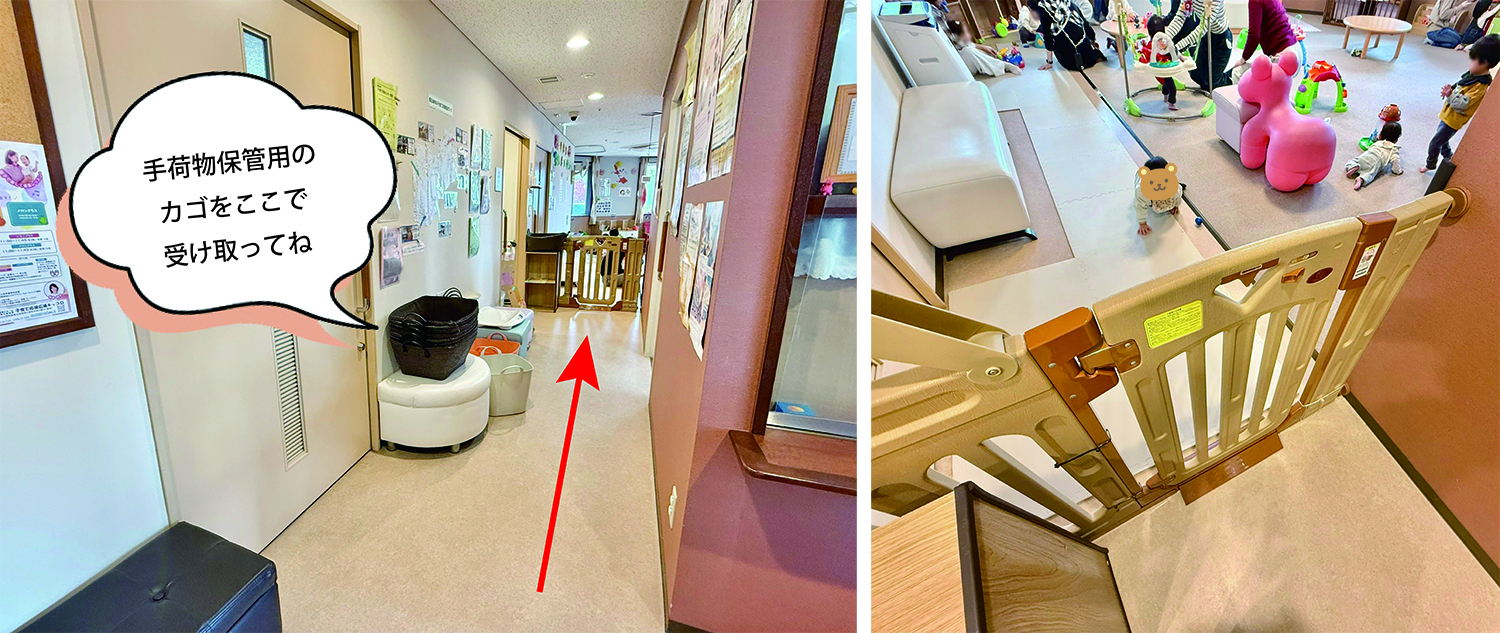 貸出し用のおもちゃは、遊び終わりましたらゲートの外にある返却用の棚(写真:右)へご返却をお願いいたします。