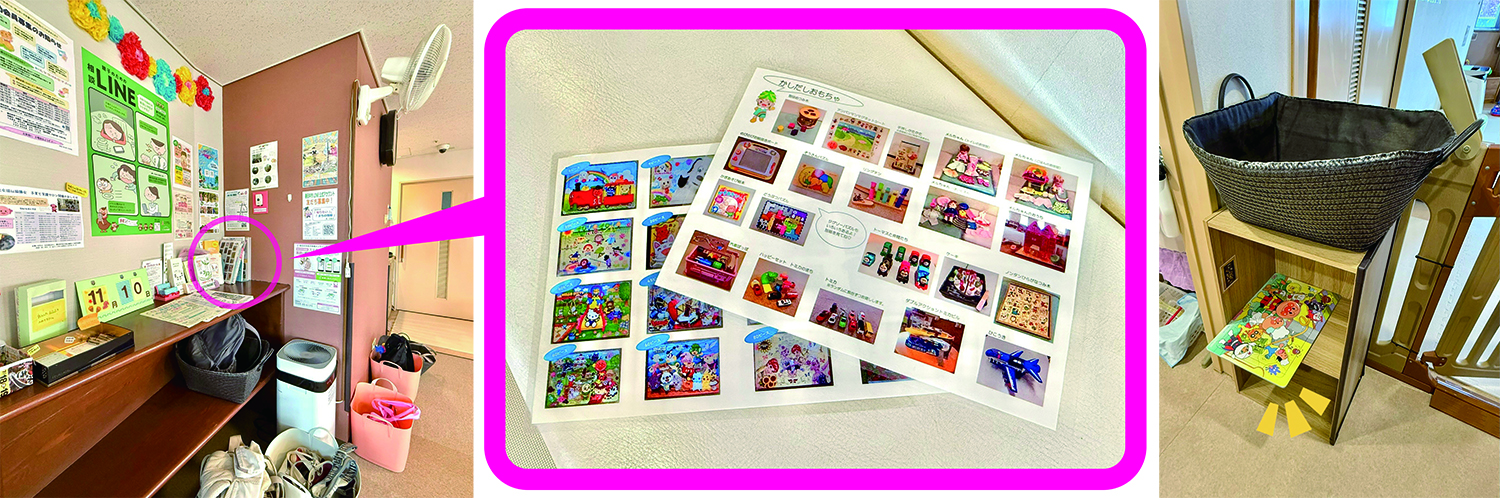 ご入り用の方は、来所票が設置されているカウンターと同じ場所に貸出し用のおもちゃ一覧表( 写真:左 )がございますので、そちらを持ってスタッフの方へお声かけください。