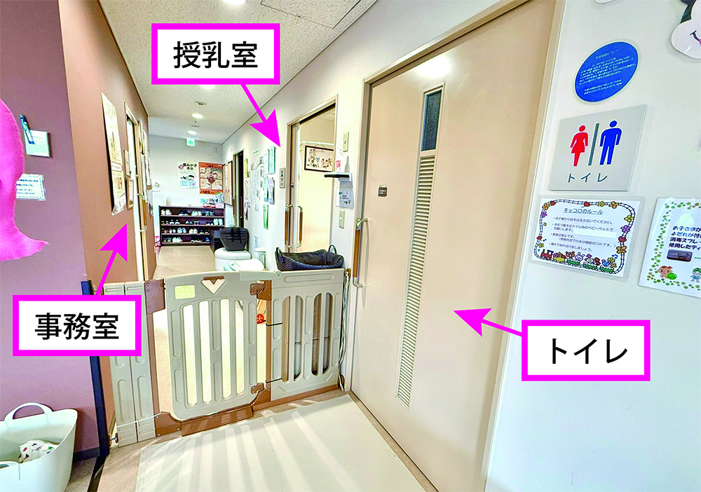 遊び場のゲート付近に、トイレ、授乳室、事務室がございます。