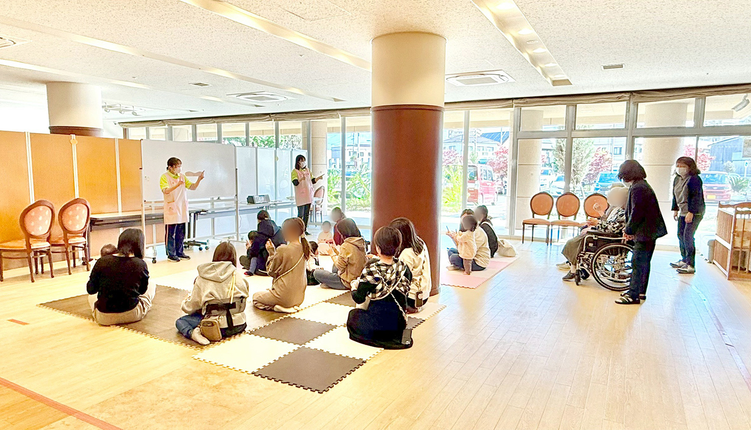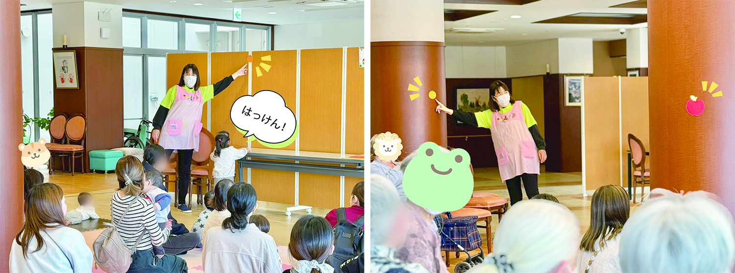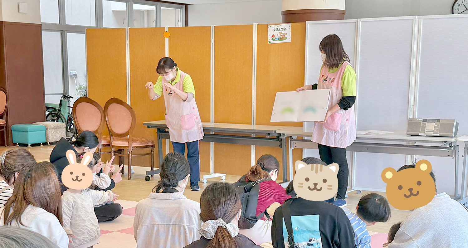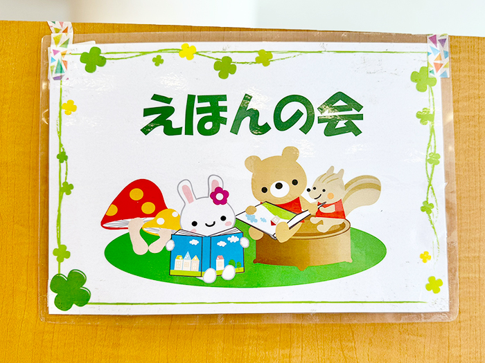 「 えほんの会 」は、その利用者様 ( おじいちゃん・おばあちゃん ) との多世代交流も楽しめるイベントとなっています。