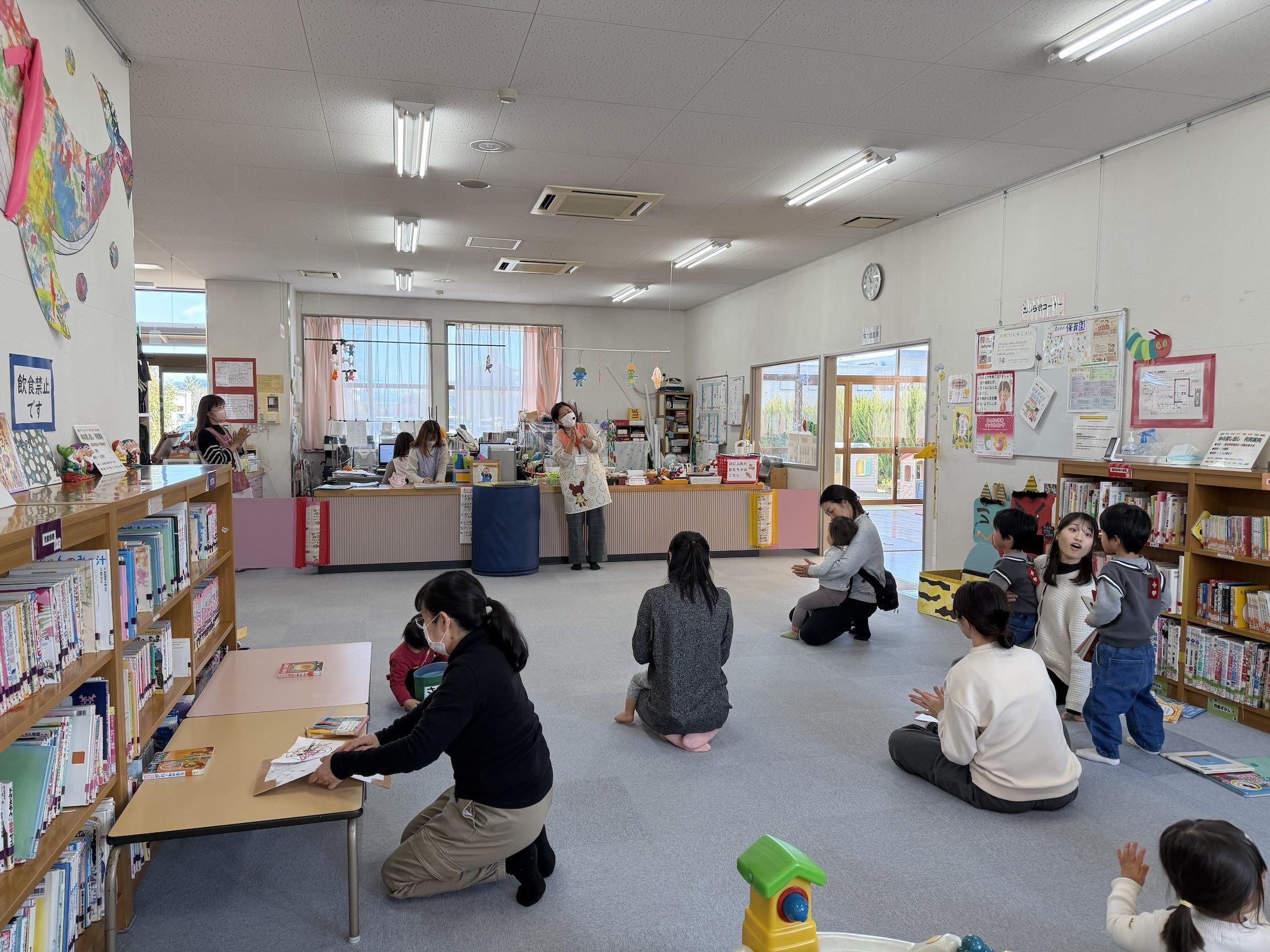 絵本を囲んで過ごす時間は、親子にとってほっとできるひととき。お子さんとの会話も広がります。まだまだゴロンとしている赤ちゃんでも参加しやすい雰囲気なので、ぜひ親子で足を運んでみてください。
