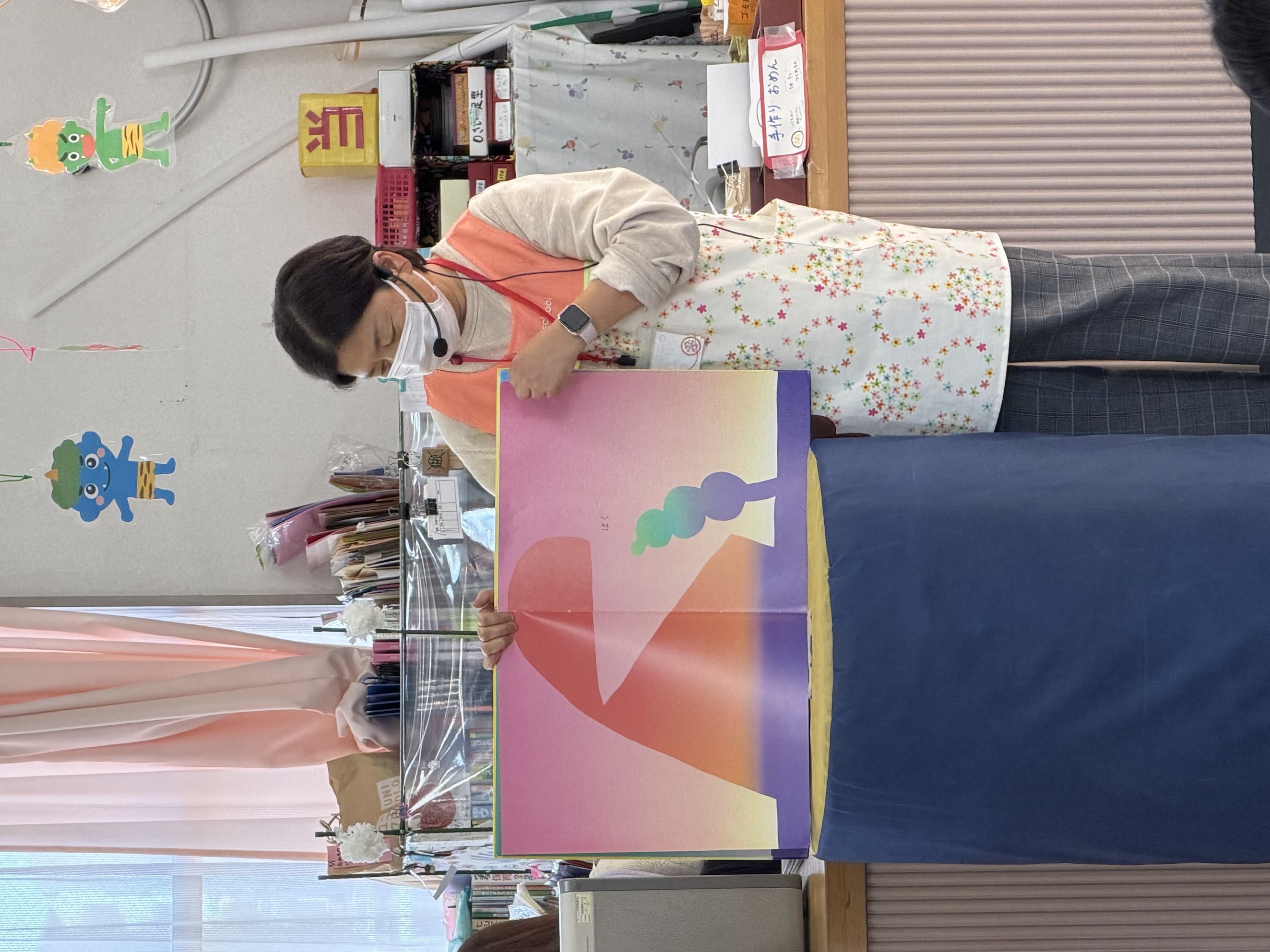 この日は、まず「もこ もこもこ」からスタート。「ぱくっ」「パチン」「にょき」などのシンプルな言葉と色の変化だけなのに、なんだかとっても面白い。だんだん本の世界に引き込まれていきます…