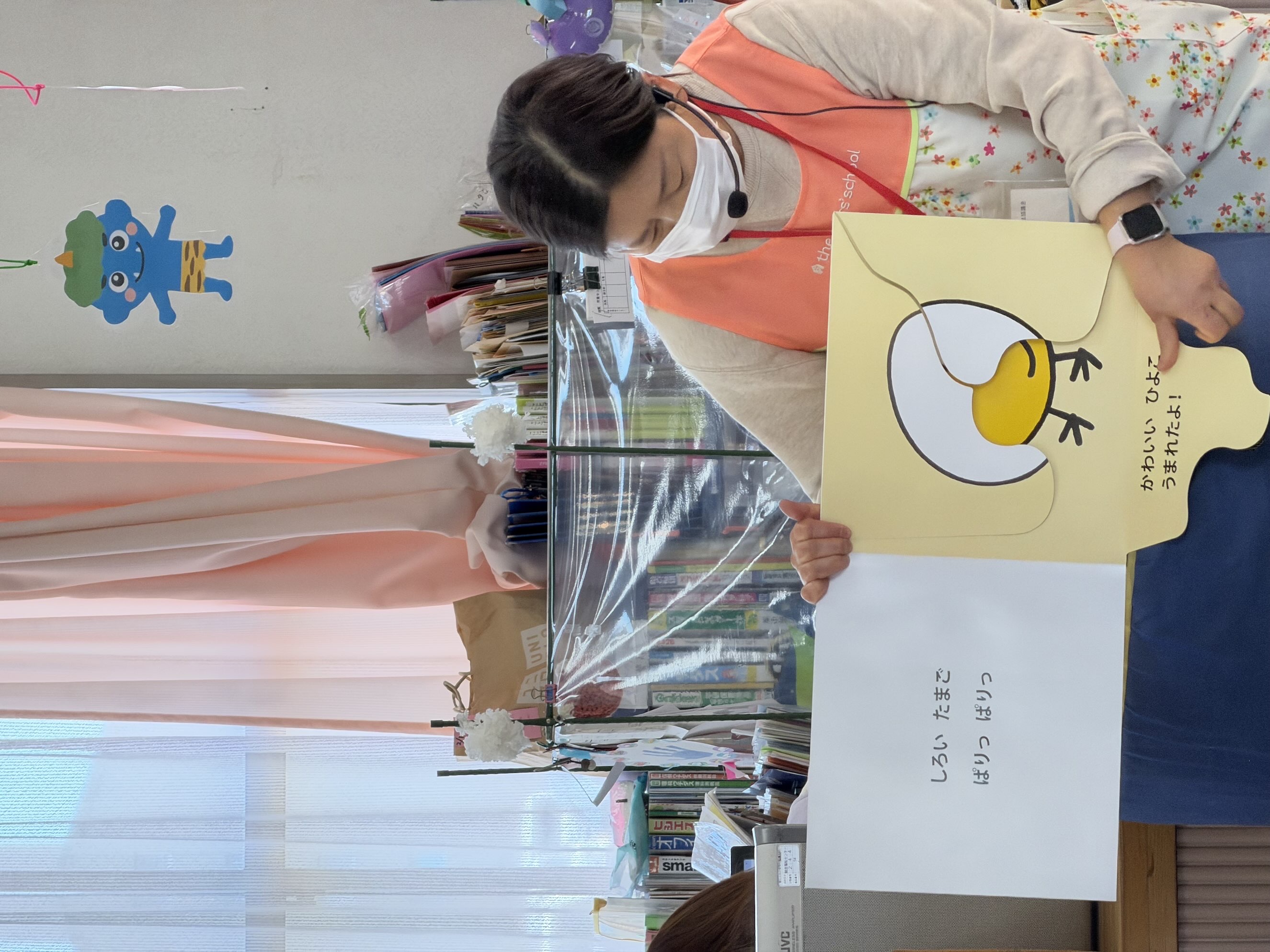 続いて「たまごのえほん」大きなたまごが割れると中からかわいい赤ちゃんが登場。「ぷっちぷち」「ぺっきっぺき」などの多彩なオノマトペに子ども達も惹きつけられていました。