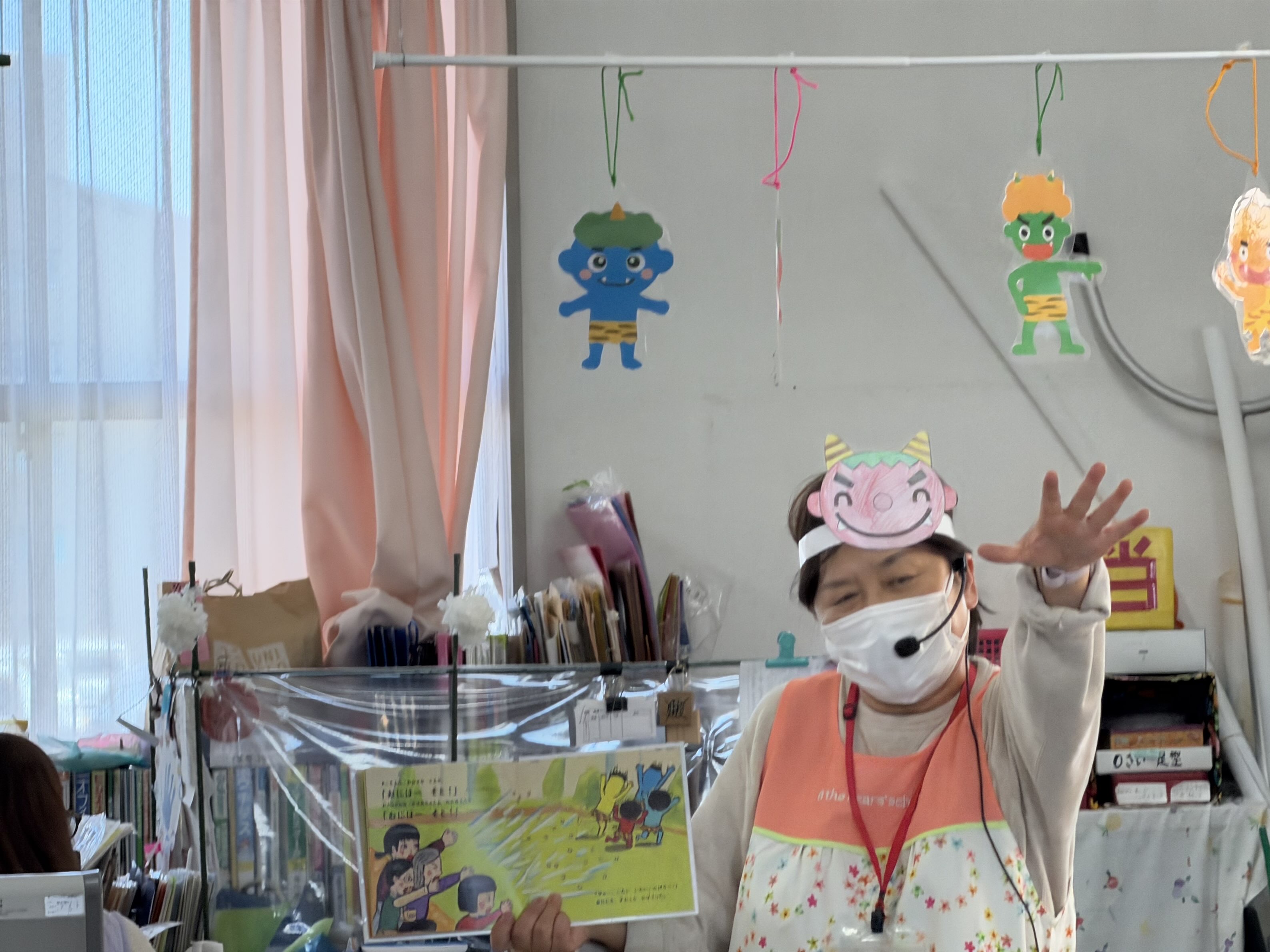 取材した日は節分ということもあり、鬼が登場する節分の絵本も読みました。児童センターのあちこちに、季節を感じられる鬼の装飾や、手作りのおもちゃがありました。季節の行事を絵本で楽しめるのも、この会の魅力です。