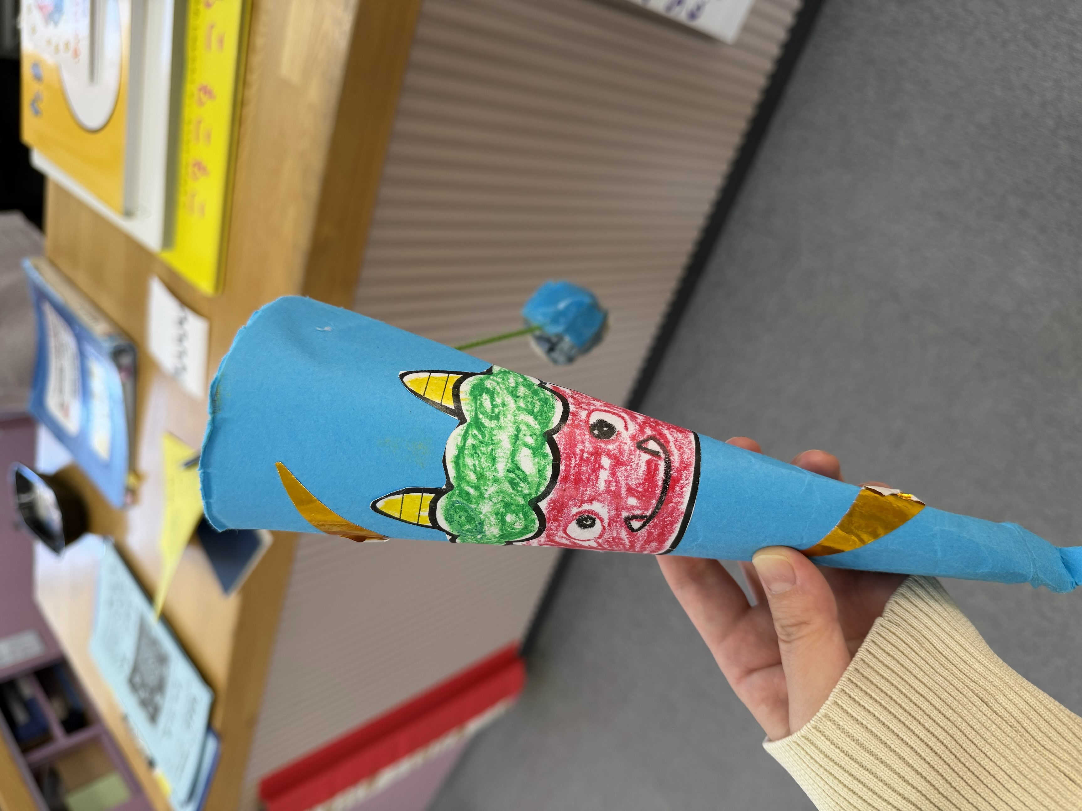 児童センターでは、季節に合わせた工作を楽しむことができます。この時は節分だったので、「鬼のこん棒けん玉」でした。