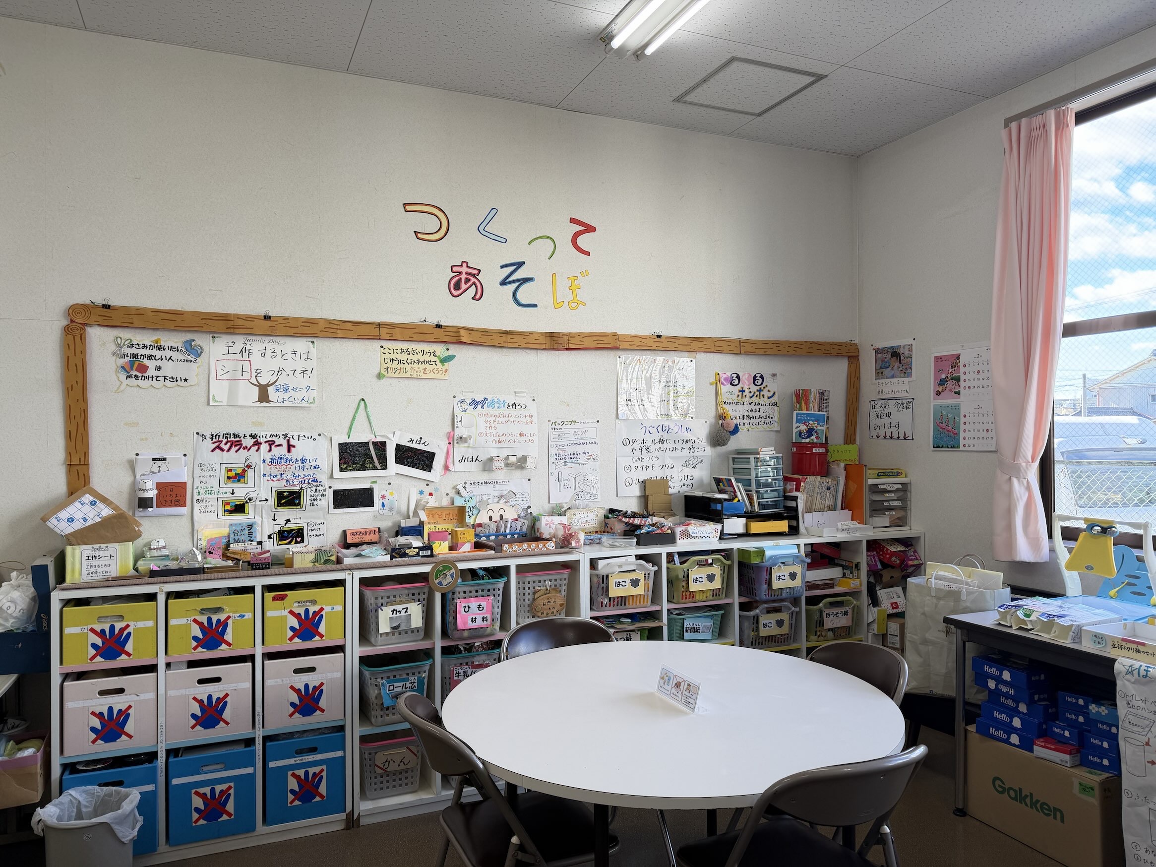 集会室には、工作コーナーがあり、スクラッチアート、パックコプター、望遠鏡、切り絵など様々な工作が楽しめます。空き箱なども沢山あり、子ども達の創作意欲を掻き立てること間違いなし!!