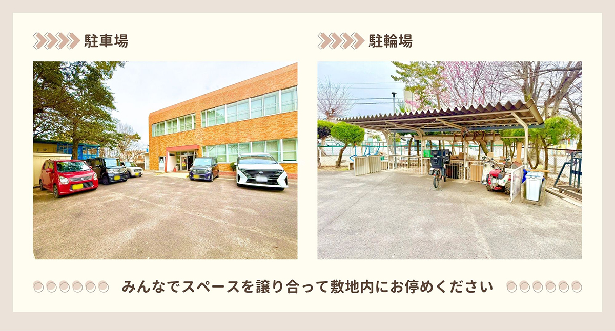 ↑車や自転車でお越しの方は、敷地内のこちらのスペースへ。